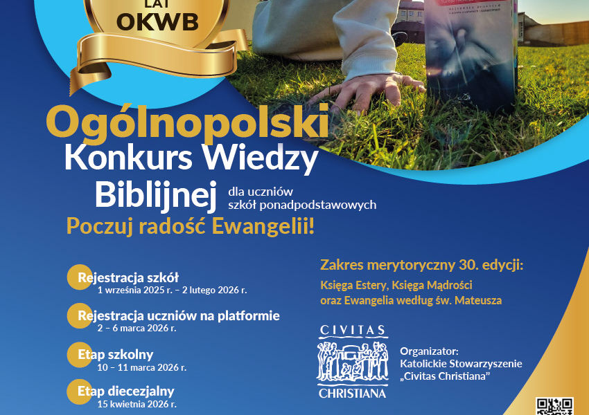 Katolickie Stowarzyszenie „Civitas Christiana” zaprasza młodzież szkół ponadpodstawowych do udziału w 30. edycji Ogólnopolskiego Konkursu Wiedzy Biblijnej. Zgłoszenie do Konkursu za pośrednictwem nauczyciela religii do 2 lutego 2026 roku.