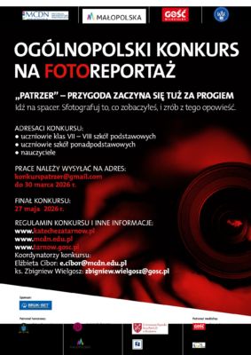 Wydział Katechetyczny Kurii Diecezjalnej w Tarnowie, Tarnowski Gość Niedzielny, Małopolskie Centrum Doskonalenia Nauczycieli Ośrodek w Tarnowie zapraszają do udziału w Ogólnopolskim Konkursie na Fotoreportaż „Patrzer – przygoda zaczyna się tuż za progiem”.
